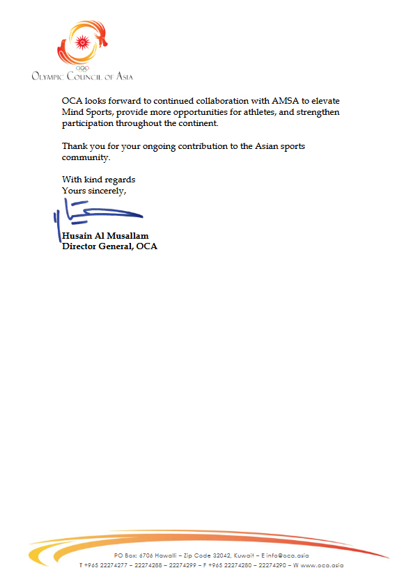 شورای المپیک اسیا OCA مشتاقانه منتظر همکاری مداوم با انجمن ورزش های ذهنی آسیا AMSA برای ارتقاء ورزشهای ذهنی، ارائه فرصتهای بیشتر برای ورزشکاران و تقویت مشارکت در سراسر قاره است. از مشارکت مستمر شما در جامعه ورزشی آسیا سپاسگزاریم.