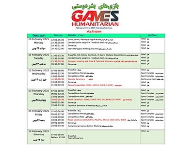 بازی های بین المللی بشردوستی 2025 03 Nov 1403 قهرمانی او-اسپرت زنان و مردان آسیا بخشی از برنامه بازی های بشردوستی بین المللی در 23 لغایت 27 بهمن ماه1403 در کرمانشاه در رشته های ذیل سازماندهی خواهد شد. ورزش های مبارزه ای، هنری، تمرکزی، بامانع و ذهنی Read More